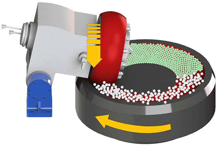 磨轮和碾盘衬件采用特殊合金耐磨材质,易损件使用寿命长,维护成本极低。磨轮外围凸面及碾盘凹面经特殊设计,使物料形成稳定有效料床,整机振动小,成分率高,相比国内同类产品产能高出20%,相比球磨机等设备能耗降低40%。