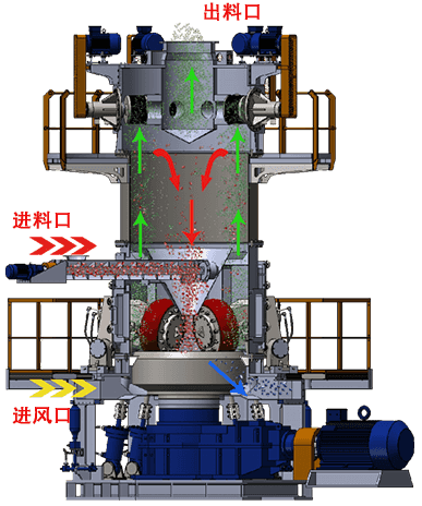主机电机通过减速机带动碾盘转动,同时高压风机产生的气流从进风口进入主机,物料经喂料螺旋送入立磨主机内落入碾盘中央,在离心力作用下,物料从碾盘中央向四周散开,经过碾盘上的辊道区域时,受磨辊压力,大块物料被直接压碎,小颗粒物料受压后在进行粒间研磨起到进一步粉碎作用,直至成粉。成粉后的物料继续向碾盘边缘移动,直到被进风口的强气流带走,气流中的物料经过上部选粉机时,在高速旋转的叶轮产生的离心力作用下,粗颗粒重新落入碾盘碾磨,合格粉体随气流穿过选粉系统后被除尘器收集,即为成品。